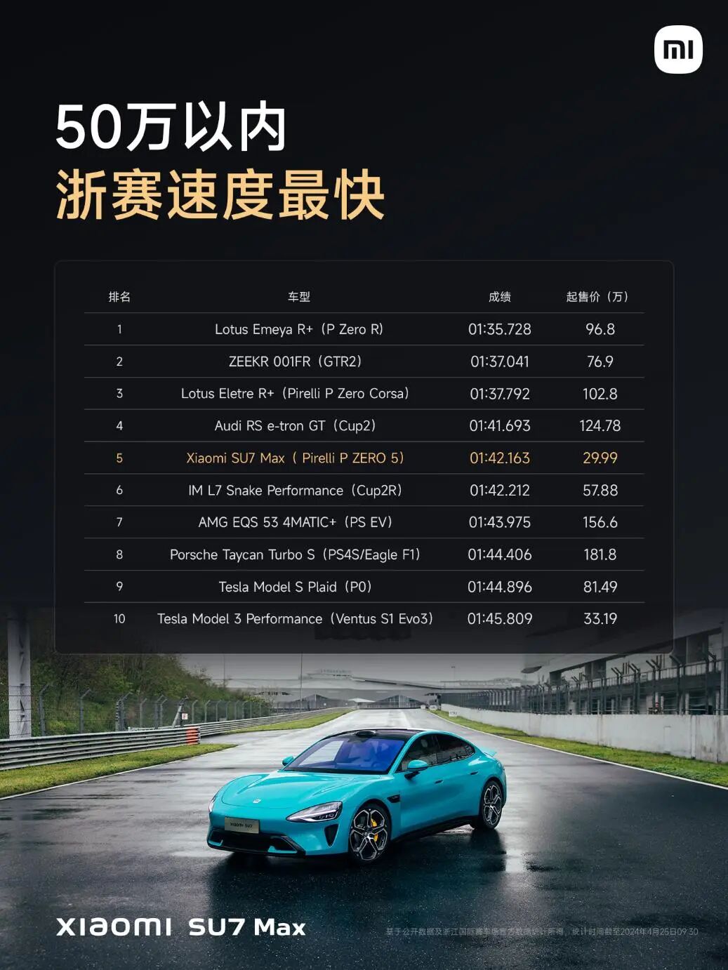赛道表现小米SU7 Max在浙赛《赛道圈速榜》中以1分42秒163的成绩超越Taycan turbo S和Model S Plaid,成为50万以内速度最快的电动车。搭载小米在研的高性能套装后,SU7 Max的圈速成绩进一步提升至1分38秒043,媲美Lotus Eletre R+等百万级豪车。