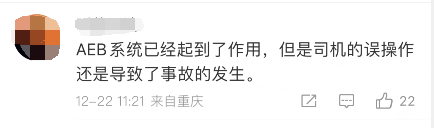 针对事故的发生,有网友评论质疑:AEB没介入吗?资料显示:AEB是可以通过雷达检测与前方车辆或障碍物的距离,并通过电子控制单元进行分析,根据不同的距离和速度判断是否有碰撞的危险,向驾驶员发出警报,最大限度地进行自动紧急刹车或使车辆减速,从而降低与前方车辆或行人发生碰撞的概率,避免事故发生。