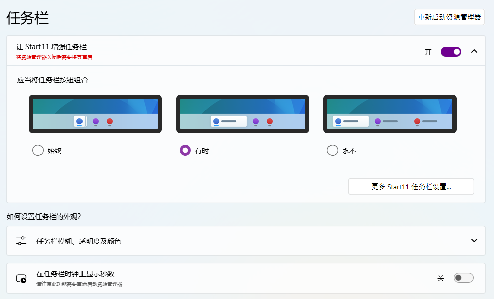 任务栏外观设置包括任务栏模糊、透明度及颜色、在任务栏时钟上显示秒数、任务栏尺寸大小等。