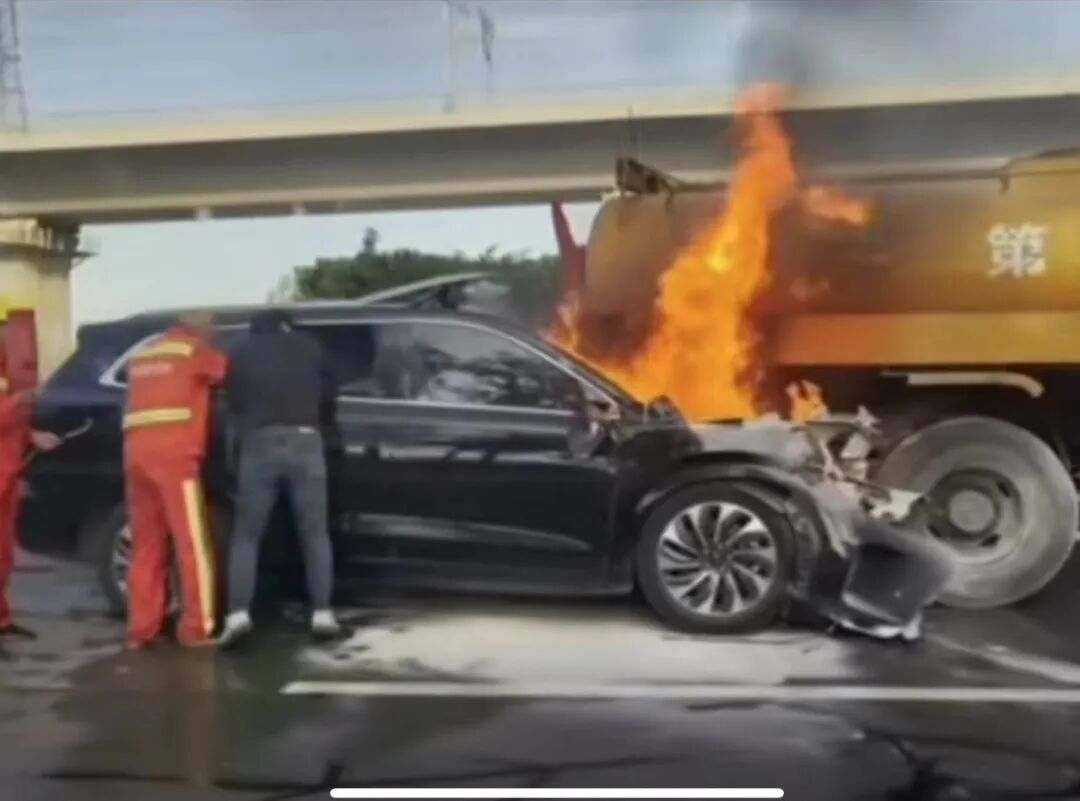 结合该名网友的爆料及此后多则网传的事故视频来看,该车辆左前侧追尾了前方洒水车的右后部,事故车辆问界M7的前车舱、A柱严重变形,车辆从前部开始起火,最终火势蔓延全车。