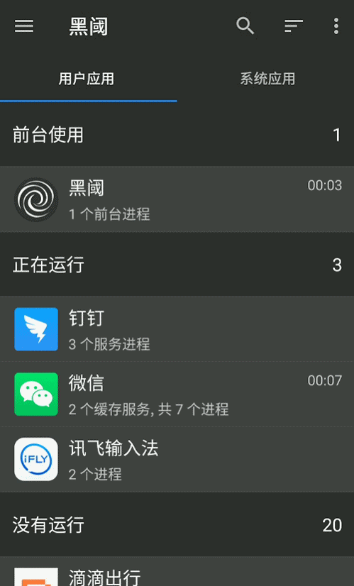 下载成功后,黑阈会自己读取你已有的软件,你只要选择你要黑阈控制的软件即可:选择软件头像,并点击右上角禁止图标。
