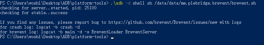接着输入这行指令:.\adb -d shell sh /data/data/me.piebridge.brevent/brevent.sh