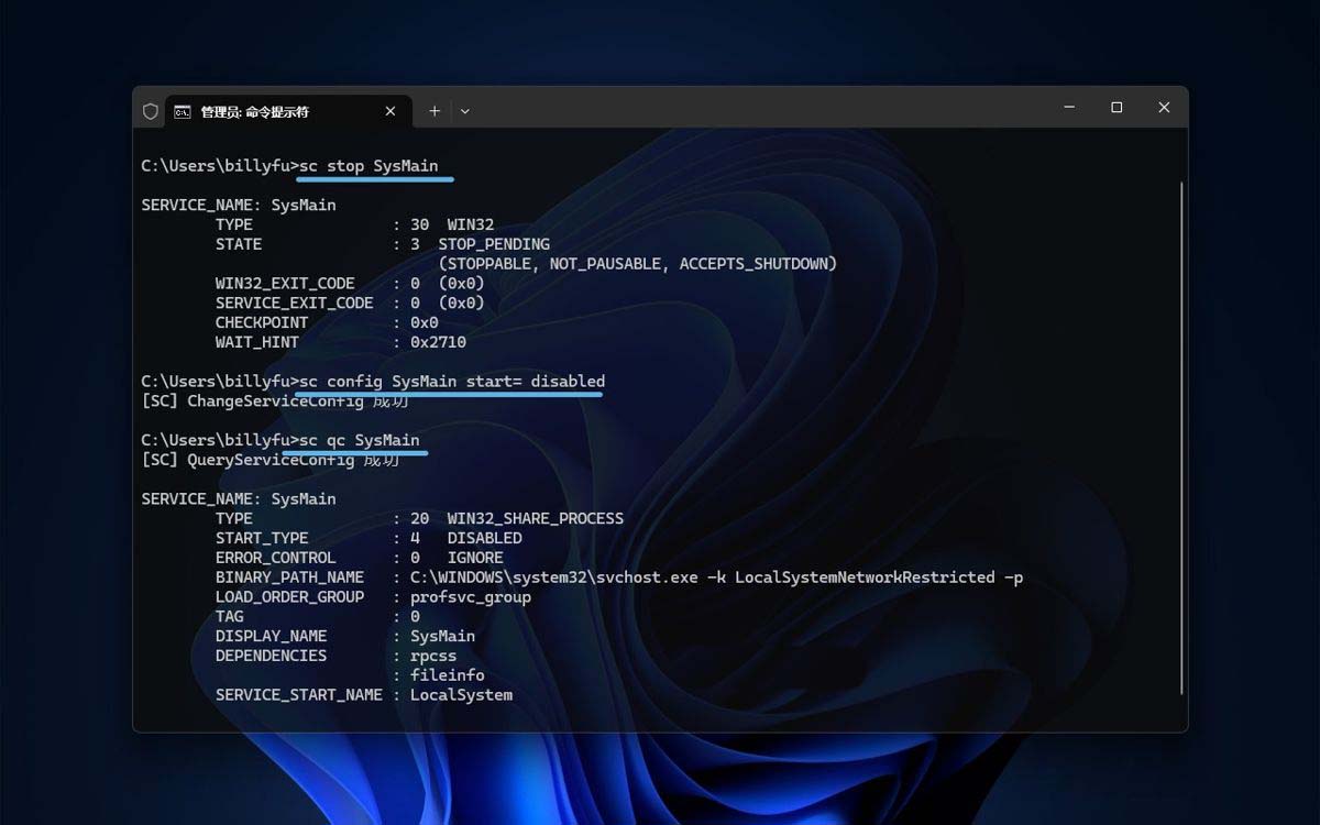 通过 sc 命令关闭并禁用 SysMain 服务