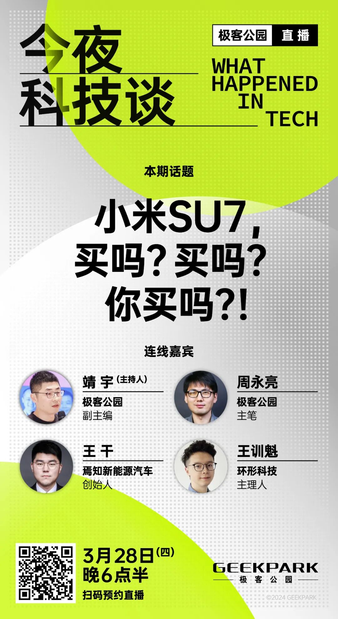 3月28日(周四)18:30,来极客公园视频号直播间,一起陪你看小米SU7发布会!更多阅读