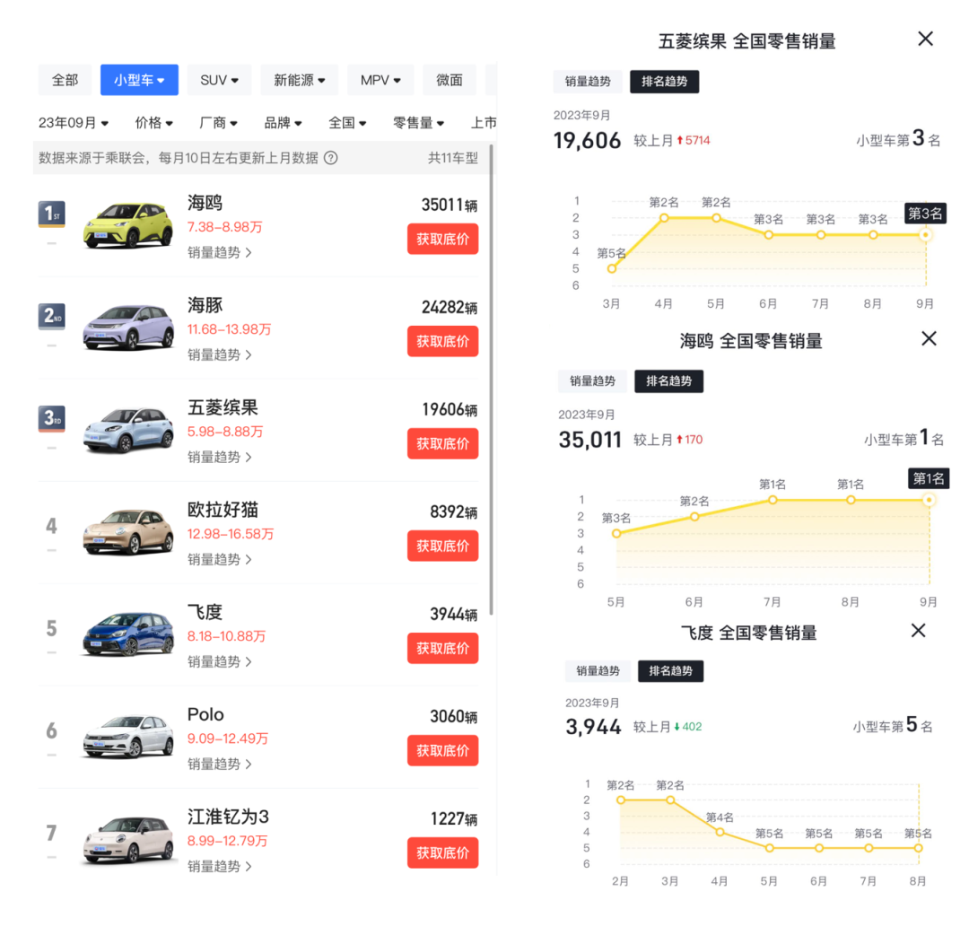 举个例子说说,在 10 万元以下的小型车市场,比亚迪有海鸥,五菱那边推了缤果,这俩无论是价格还是尺寸都很相似( 海豚售价比这俩高一个档次,就不做讨论 ),参数、配置上也是不分伯仲。
